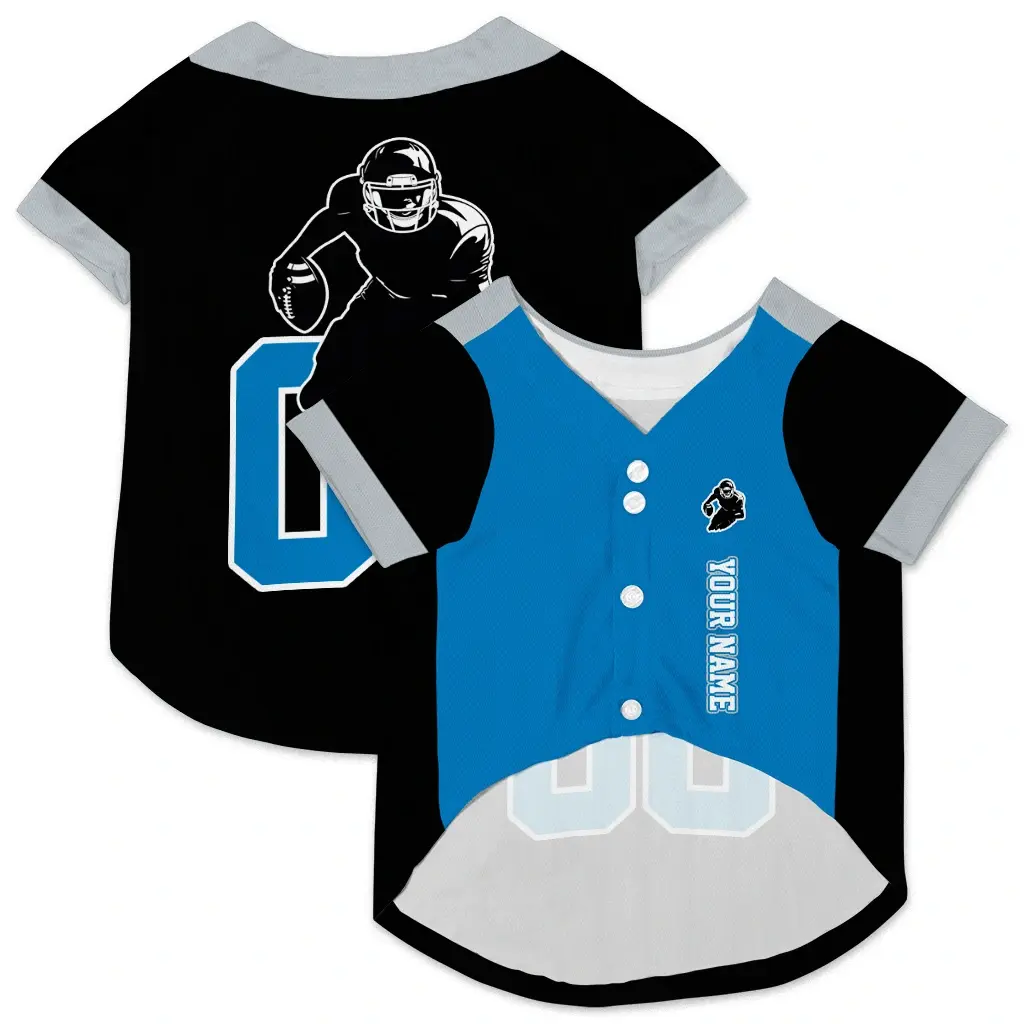 Bring the stadium energy to your home with our Custom Black, Sky Blue and Gray Classic Style Dog Jersey – Personalized with Name and Number. This breathable dog shirt is meticulously designed for dog parents who want to combine their love for the game with optimal comfort for their furry companions. Whether it’s a weekend tailgate or a neighborhood walk, your dog will lead the pack in this vibrant, sports-inspired dog jersey.